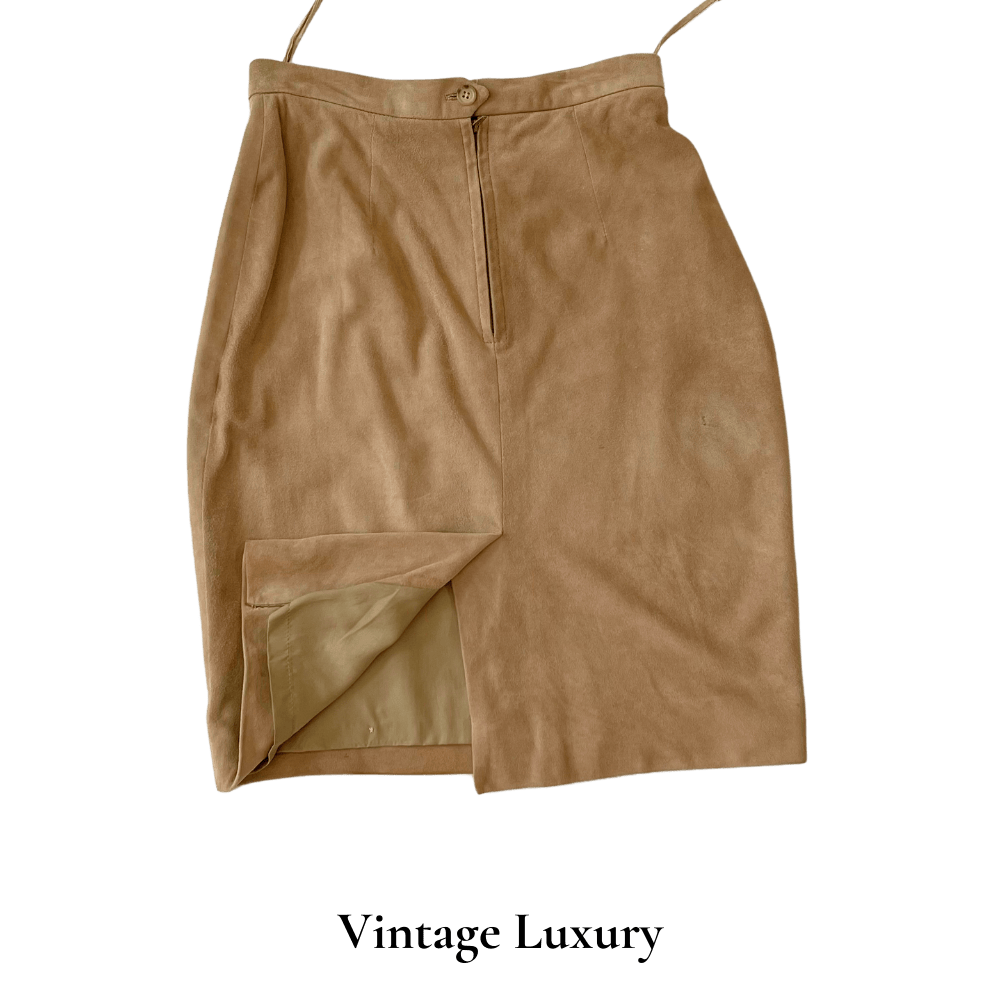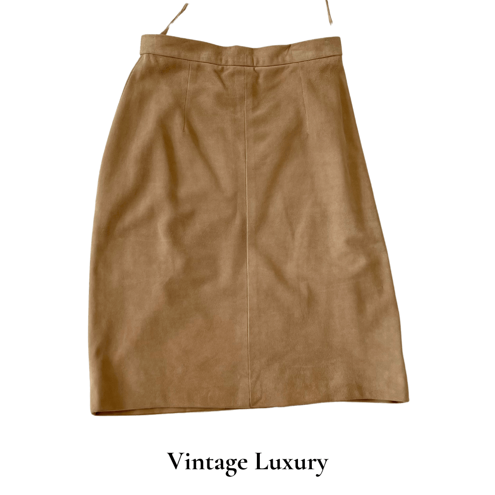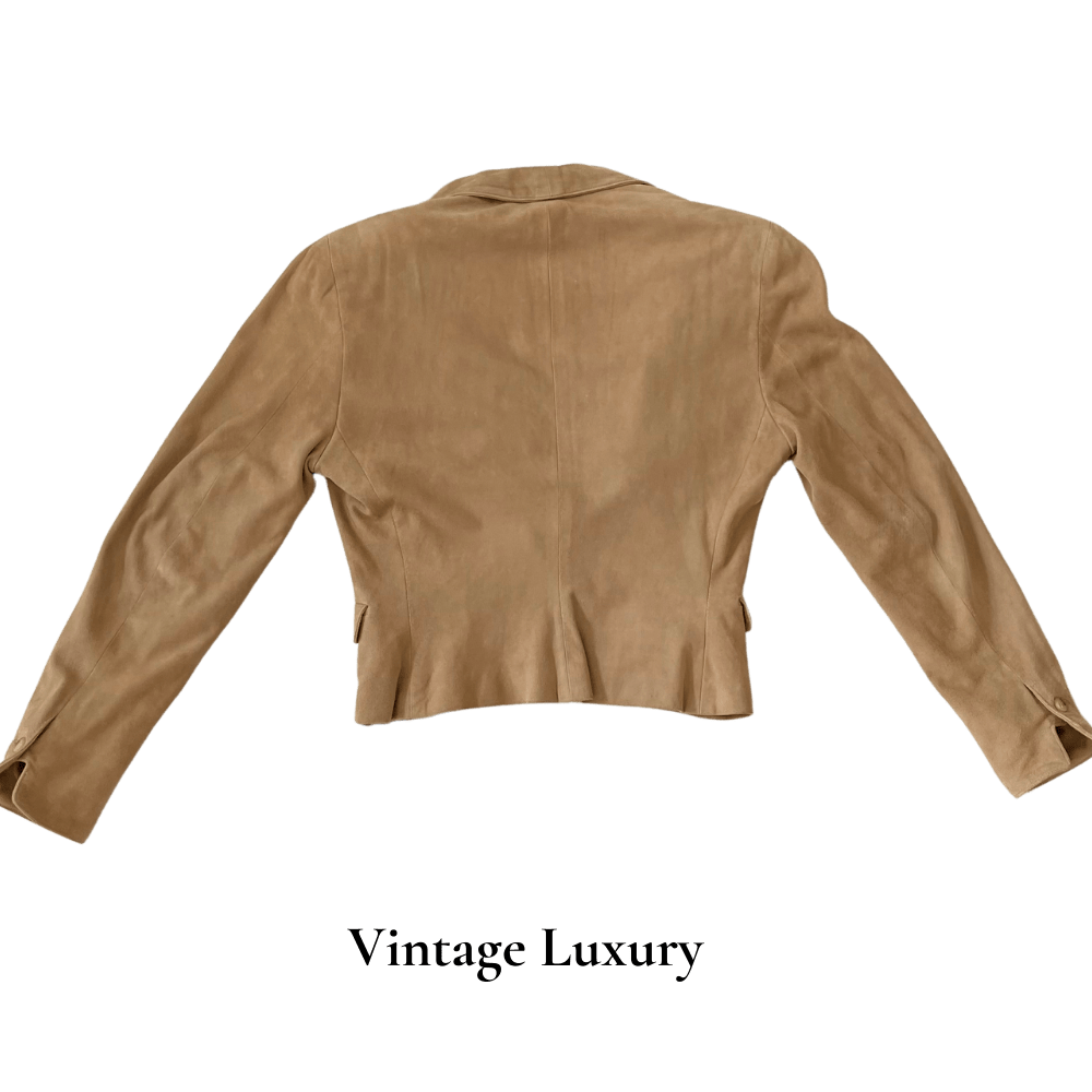A stunning 90s Ralph Lauren Purple Label suede set featuring a fitted crop jacket and A-line skirt. This vintage apparel gem blends timeless elegance with luxury craftsmanship—soft, light tan suede, beautifully tailored, and immaculately preserved. A rare Ralph Lauren matching set for true vintage collectors.
