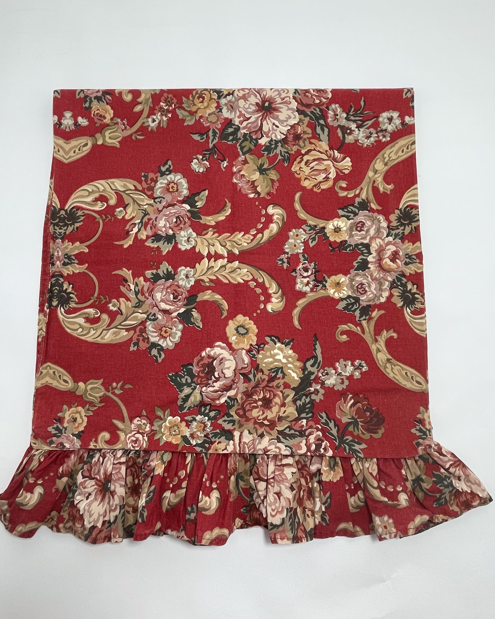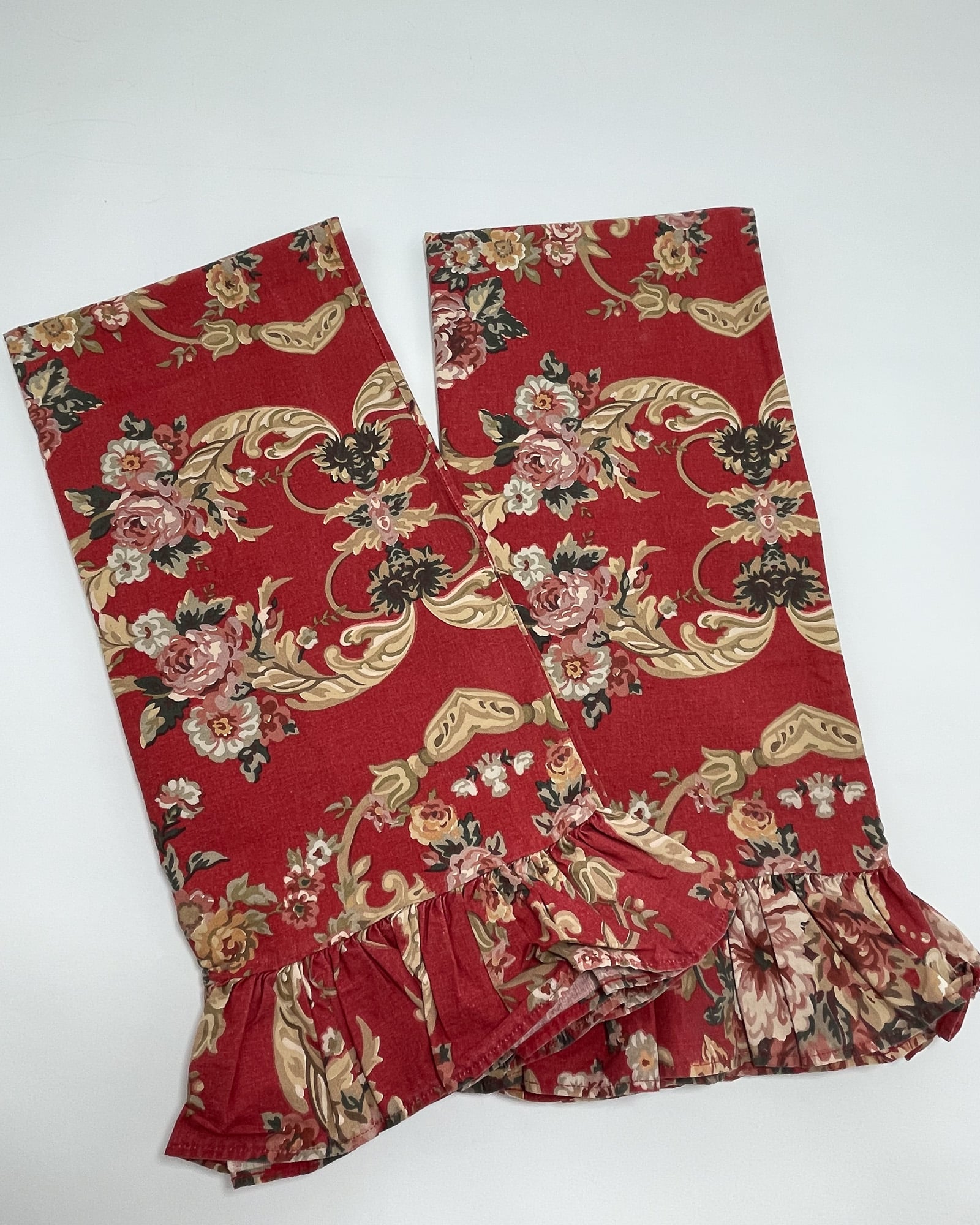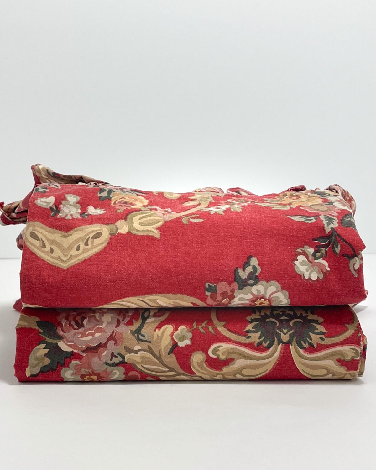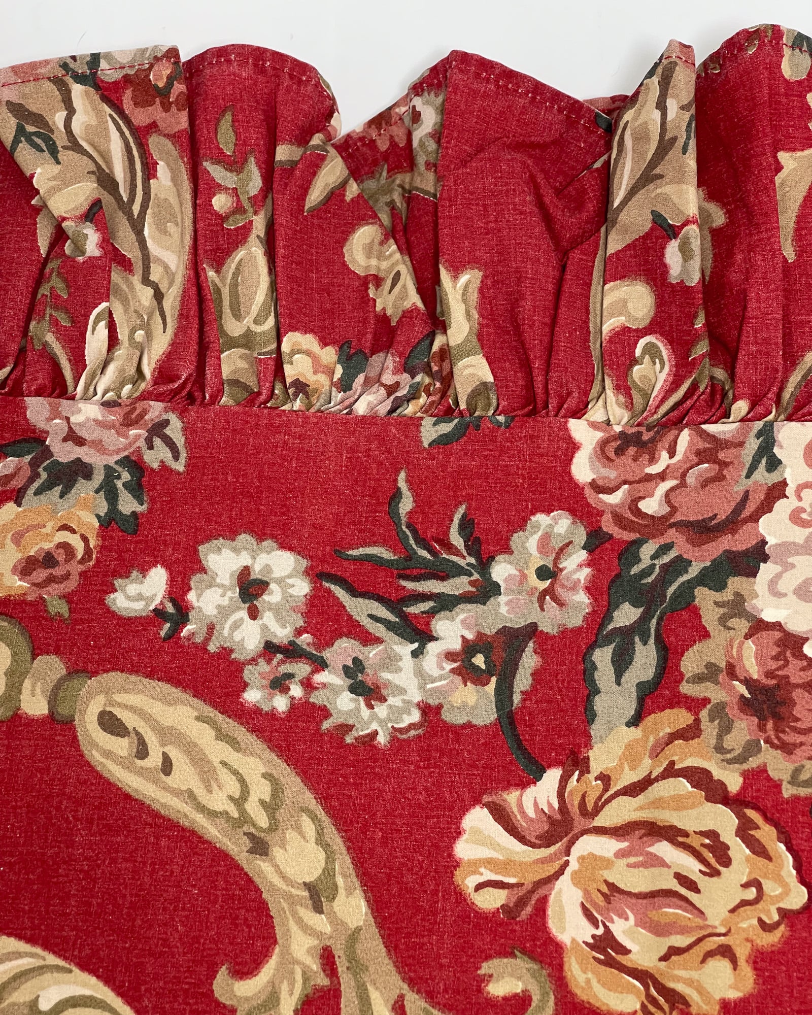 Vintage Ralph Lauren Danielle king pillowcases in a rich red floral with classic scrolling detail, finished with a soft gathered ruffled edge. A warm, heritage-inspired pattern that blends traditional elegance with cottage character. Carefully cleaned and prepared, these pillowcases offer a distinctive, collected look for refined vintage bedding.