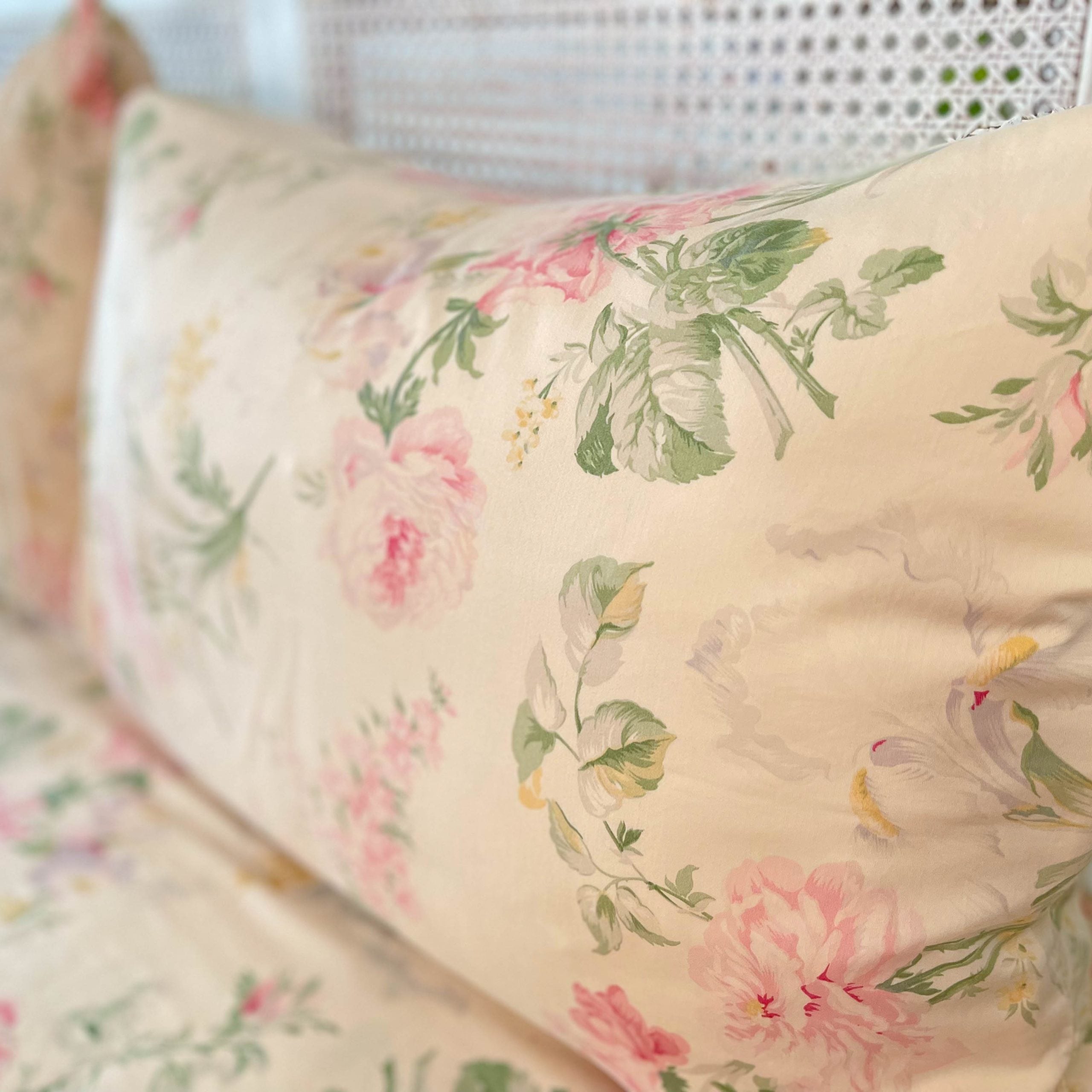 Rare Ralph Lauren “Therese” Queen bedding set with duvet cover, flat and fitted sheets, and pillowcases. Features a romantic vintage floral design in soft rose tones. 100% cotton and in excellent condition. A retired collection perfect for traditional and floral-inspired interiors.