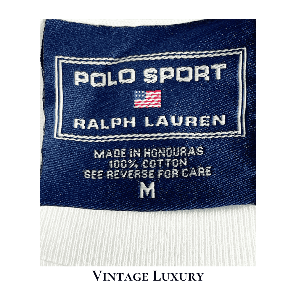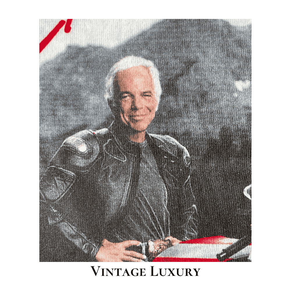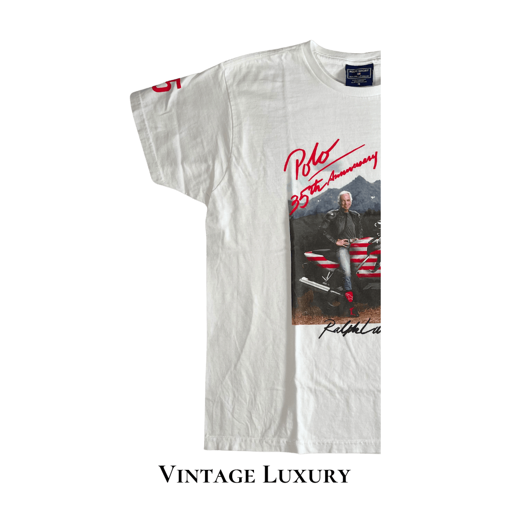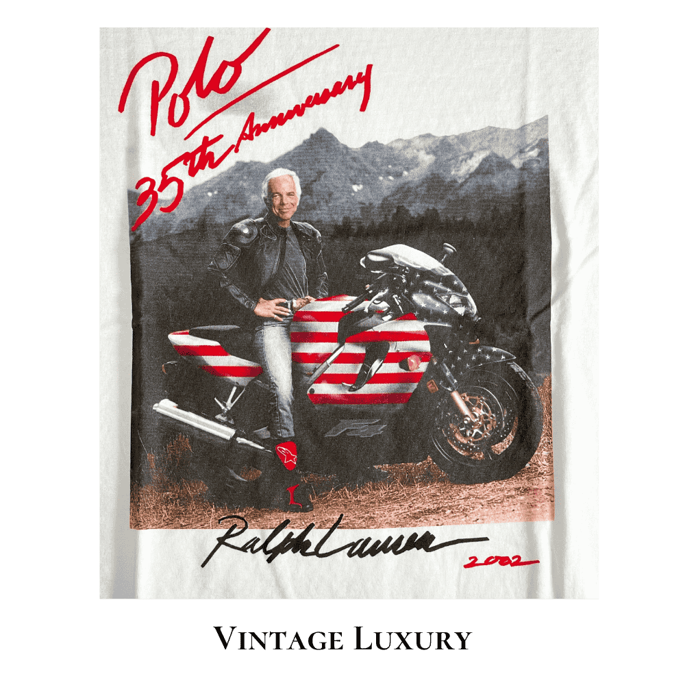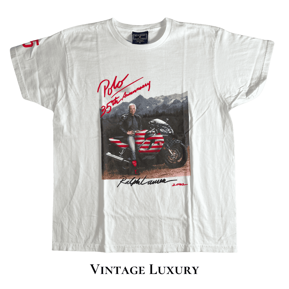 | Design | 35th anniversary with this rare 2002 Summer Outing T-shirt featuring Ralph Lauren on an MV Agusta F4 motorcycle with the American flag, complemented by “Polo 35th Anniversary” in red cursive and a facsimile of his signature in black at the bottom. |