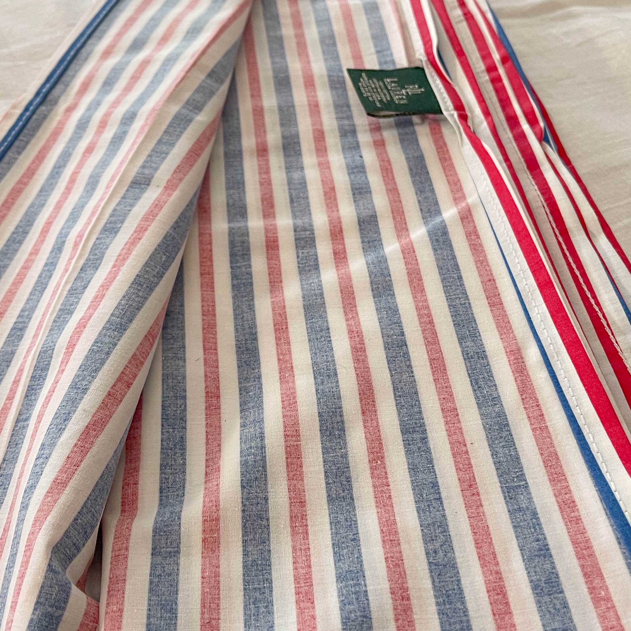 Rare Ralph Lauren King sheet set in the retired “American Summer Stripe” design. Made from crisp 100% cotton with bold red, white, and blue stripes. Includes a flat sheet, fitted sheet, and pillowcases. In excellent condition — a classic, all-American vintage bedding set.