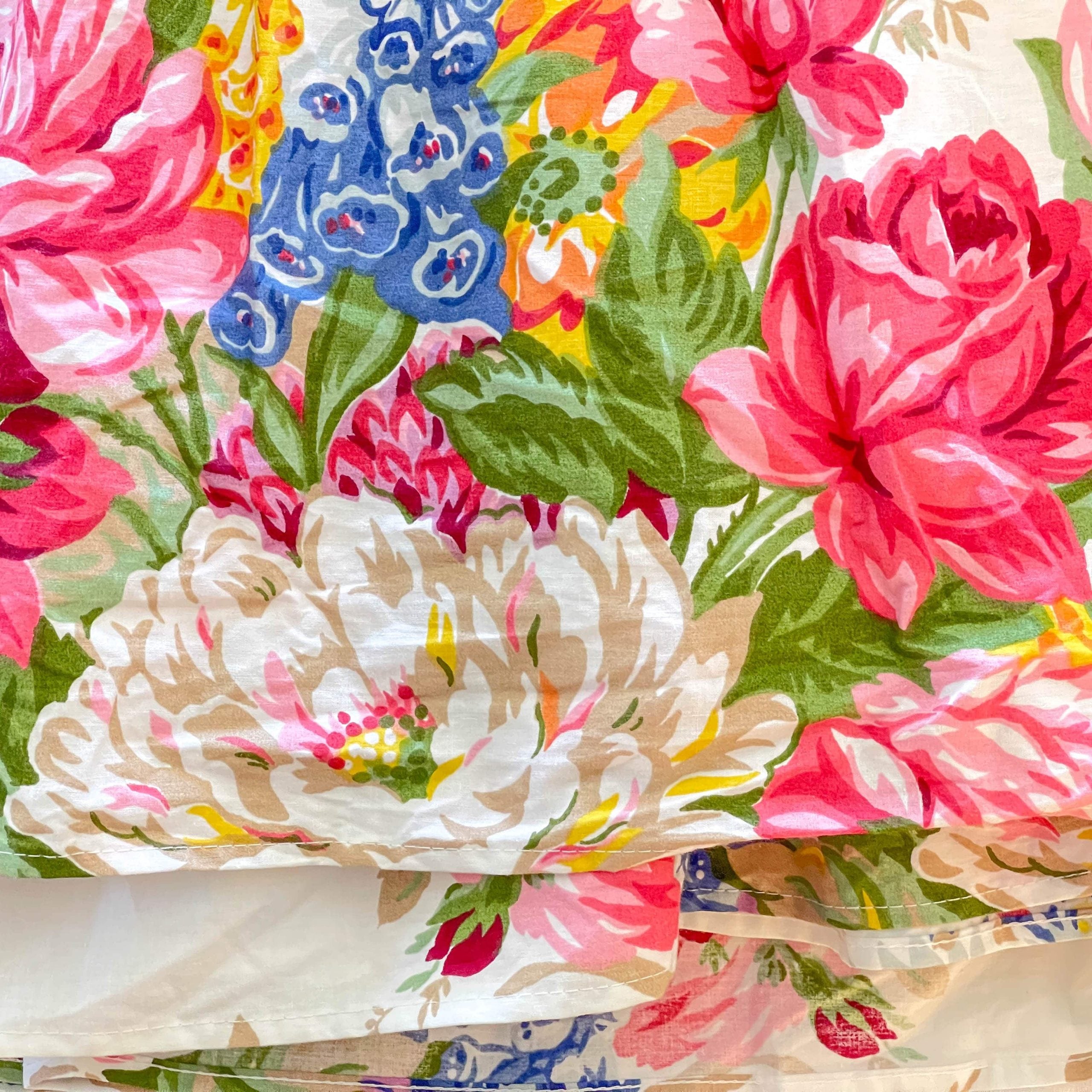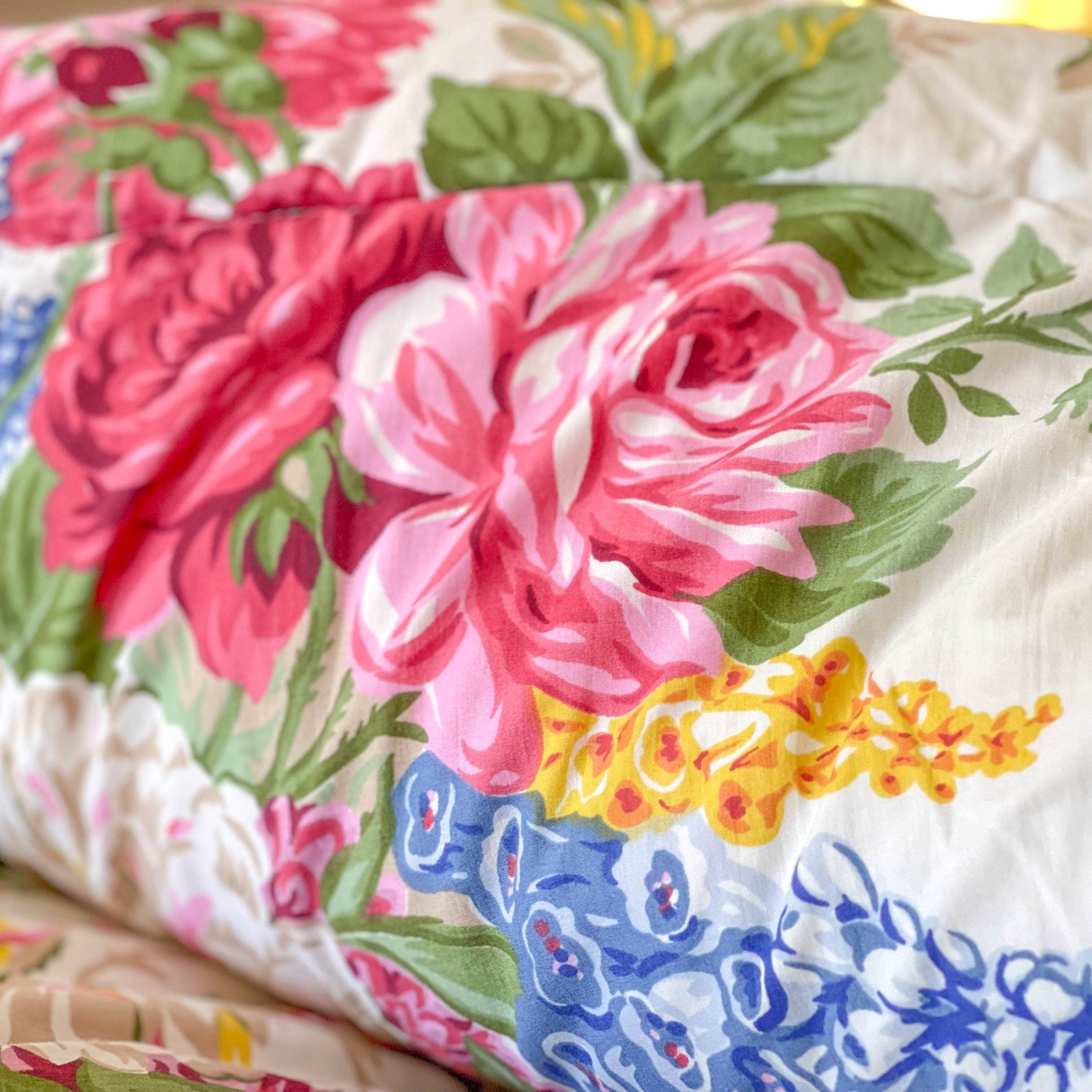 Rare Ralph Lauren “Melissa on White” King bedding set featuring a comforter, sheets, bedskirt, curtain panels, and table square. Made from 100% cotton with a soft vintage floral print. In excellent condition — a discontinued floral bedding set perfect for collectors and romantic interiors.