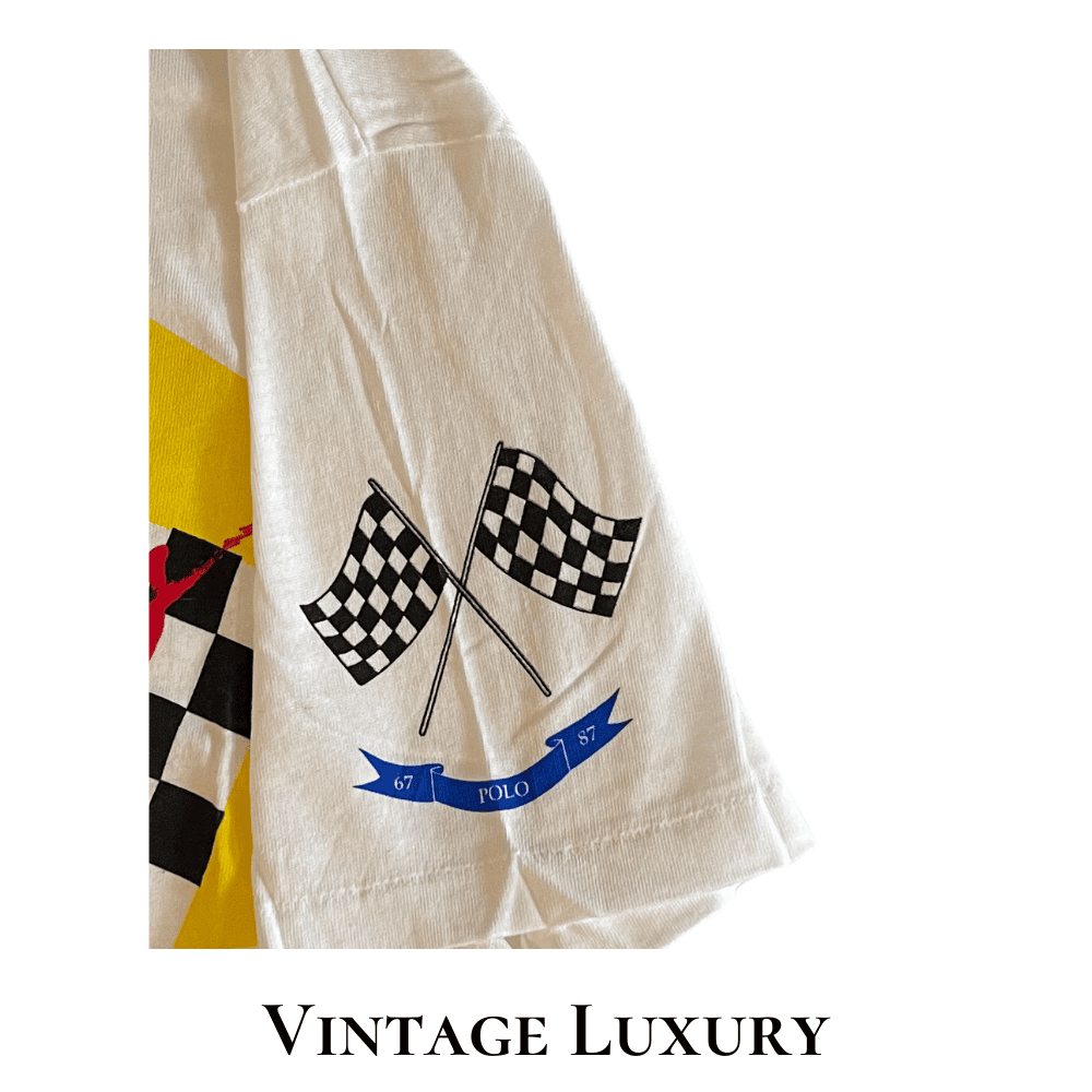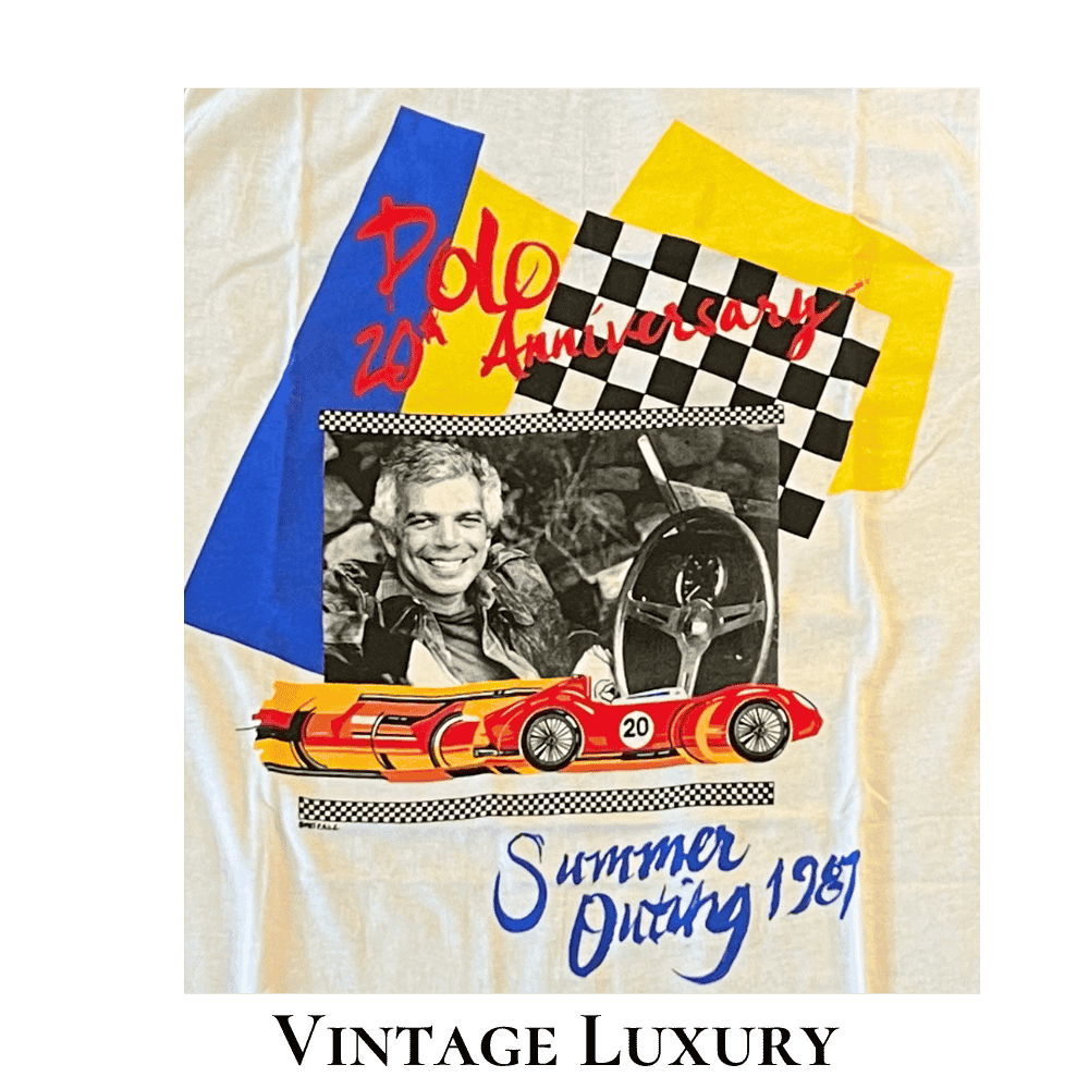 | Design | The 1987 Polo Ralph Lauren Summer Outing T-shirt features a vibrant design with a checkered flag, “Polo 20th Anniversary” in red, and Ralph Lauren behind the wheel of a sports car. |
