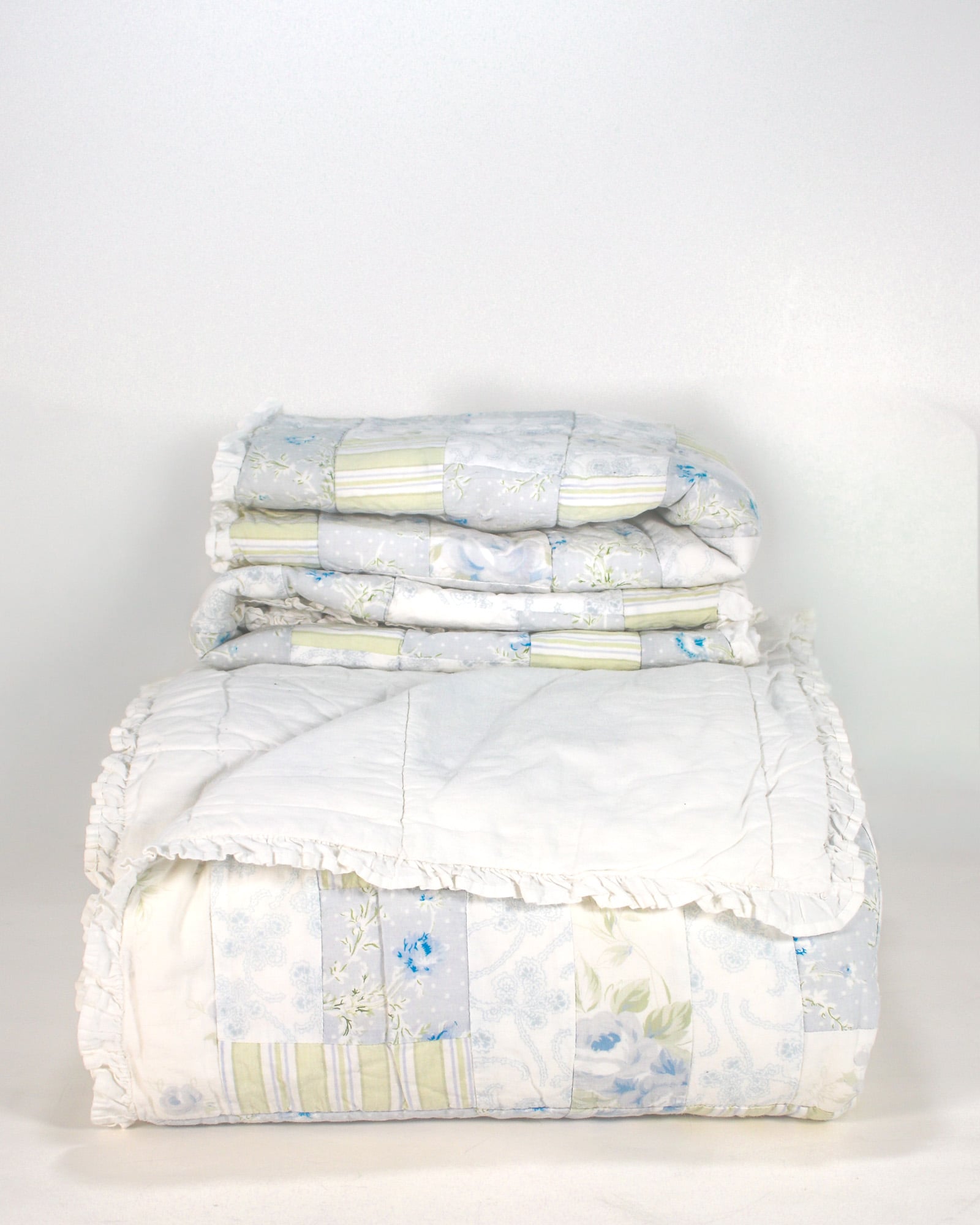 The matching shams mirror the quilt’s patchwork design and full ruffle trim, creating a cohesive, layered statement. Like the quilt, they reverse to white for versatile styling.