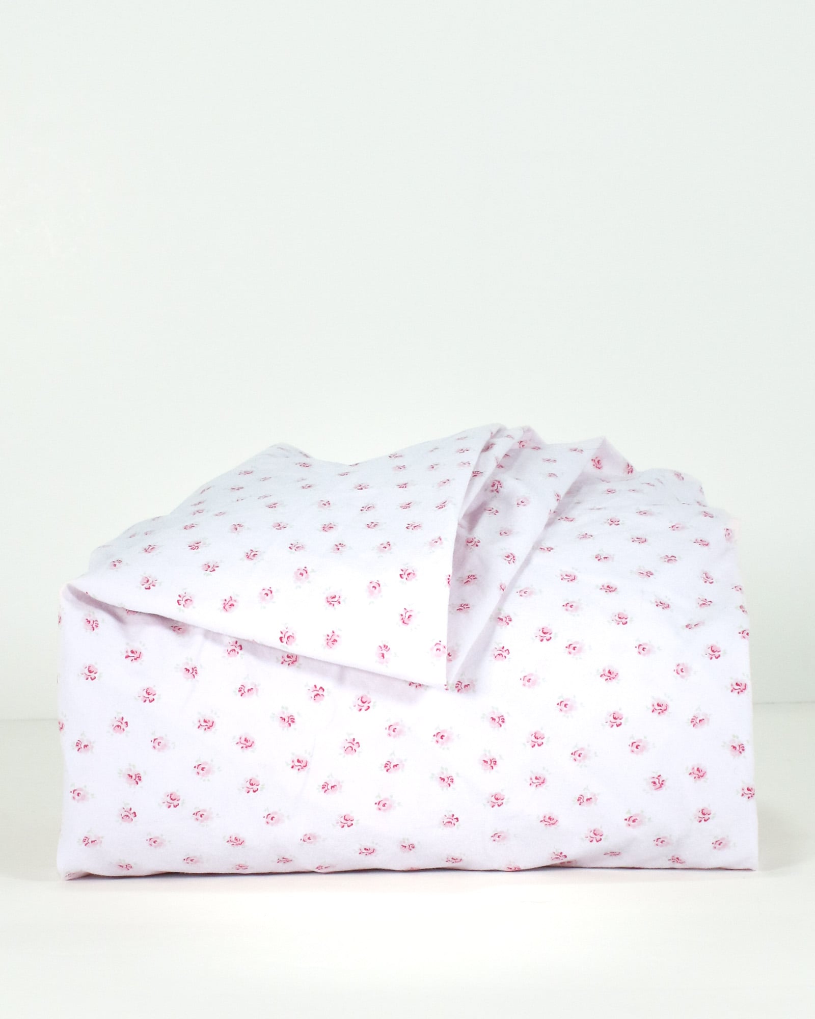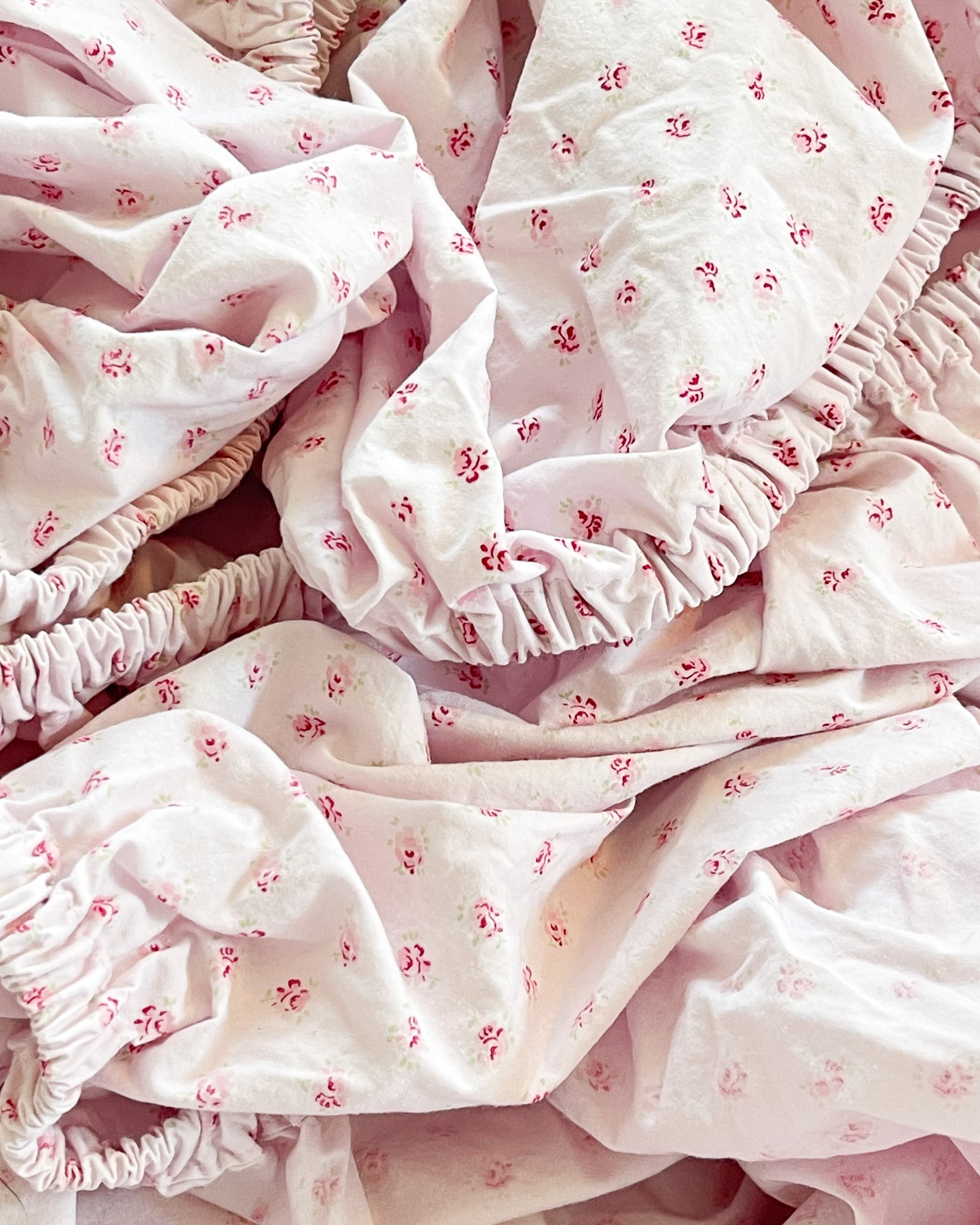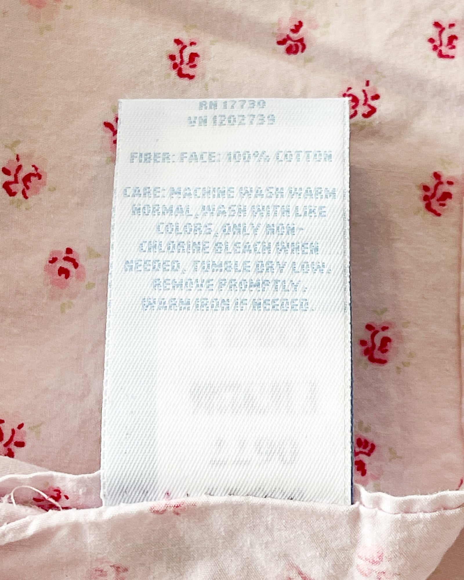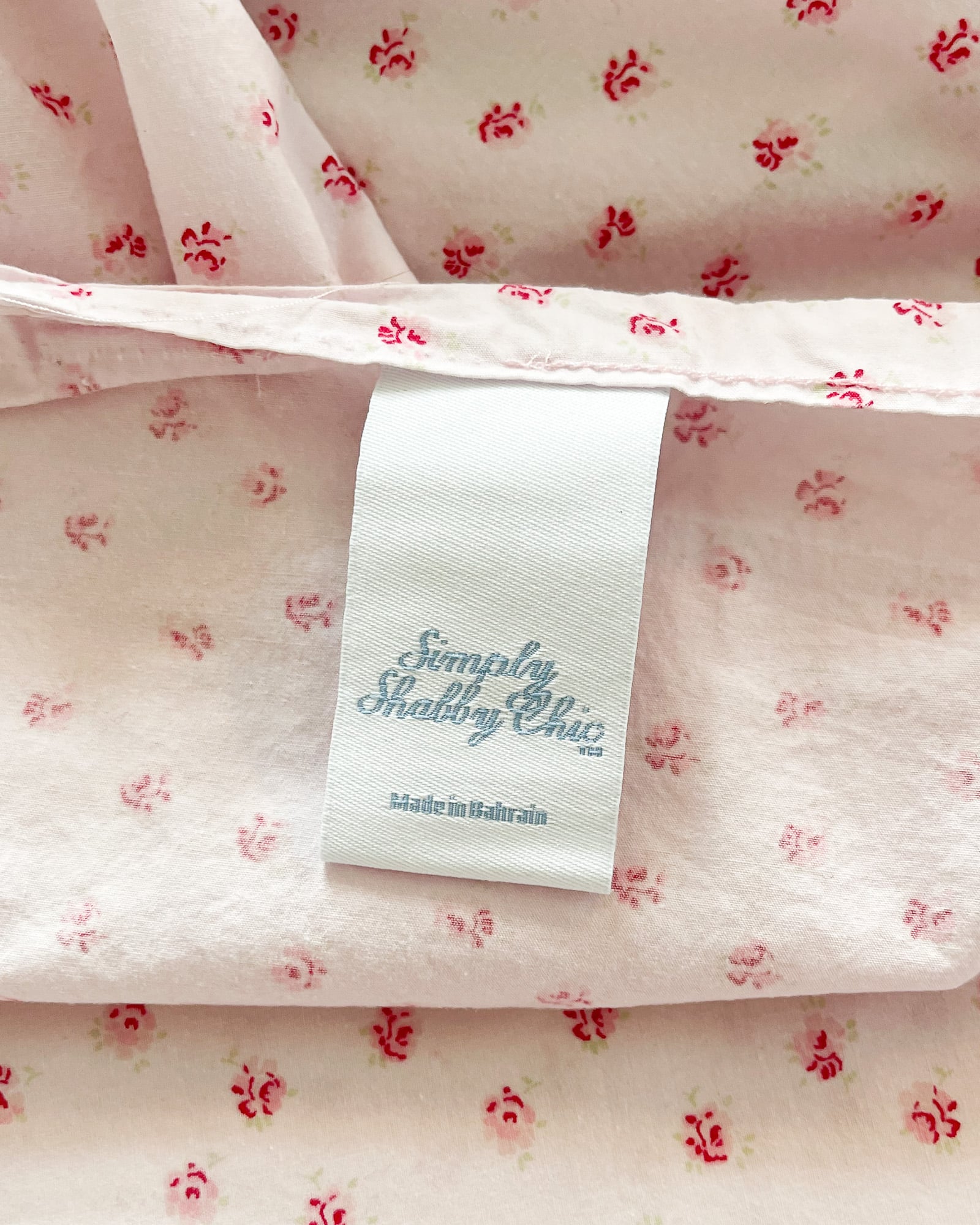 A Simply Shabby Chic full fitted sheet in the beloved Candy Cane Floral pattern, featuring a pink background with delicate pink rosebud florals. This Target-era cotton piece offers the soft, romantic character and breathable comfort that made original Simply Shabby Chic bedding so sought after. 15″ drop.