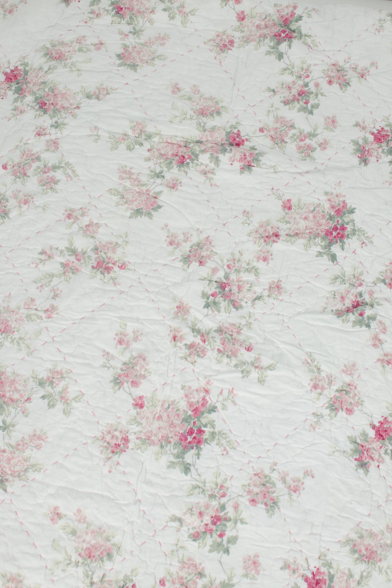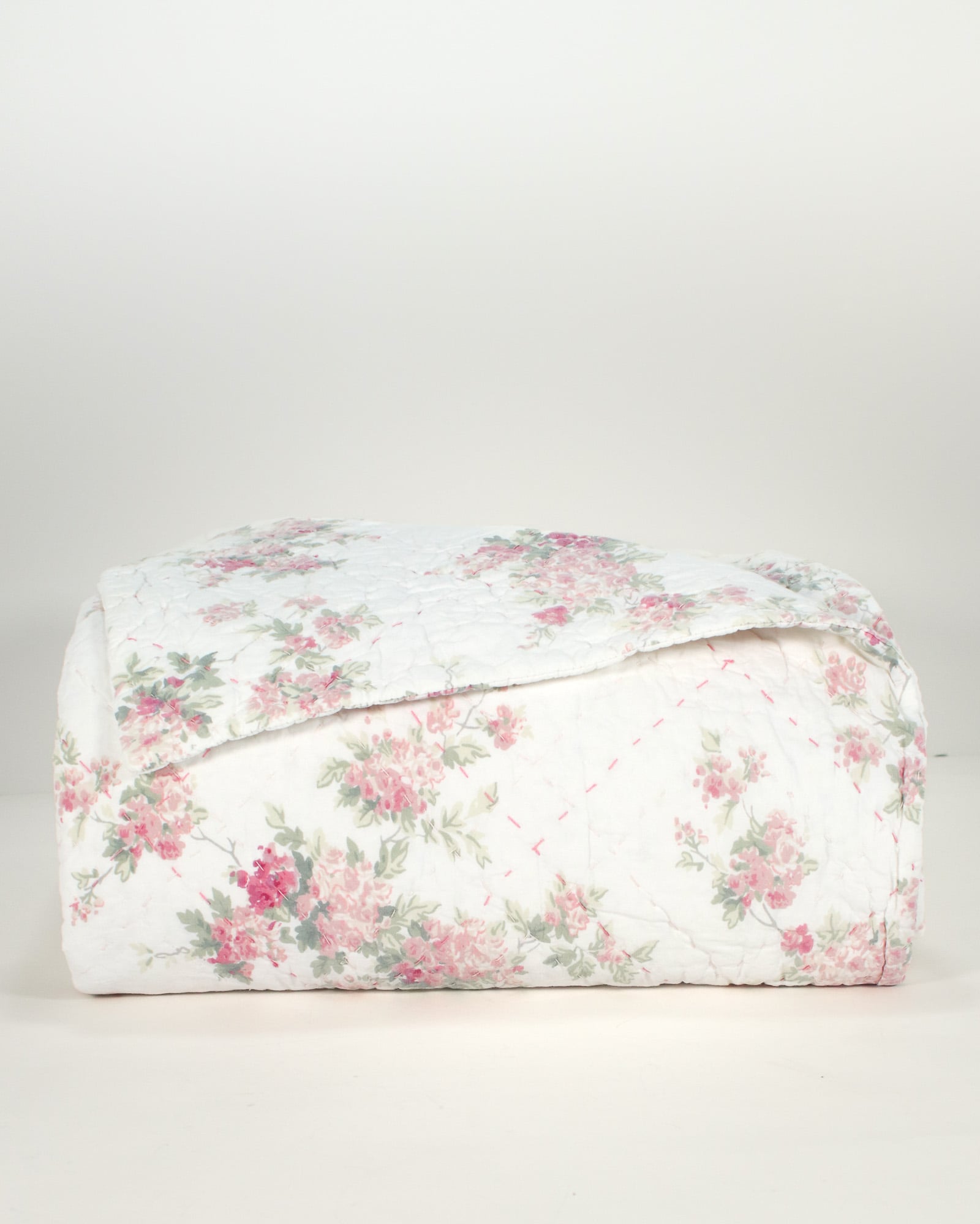 Discontinued Simply Shabby Chic rose top-stitched King quilt crafted in breathable 100% cotton. Designed in a soft romantic blush tone with the same floral pattern on both sides, it offers lightweight comfort and effortless layering for cottage, farmhouse, or vintage-inspired bedrooms. Pink top-stitching adds a charming detail.
