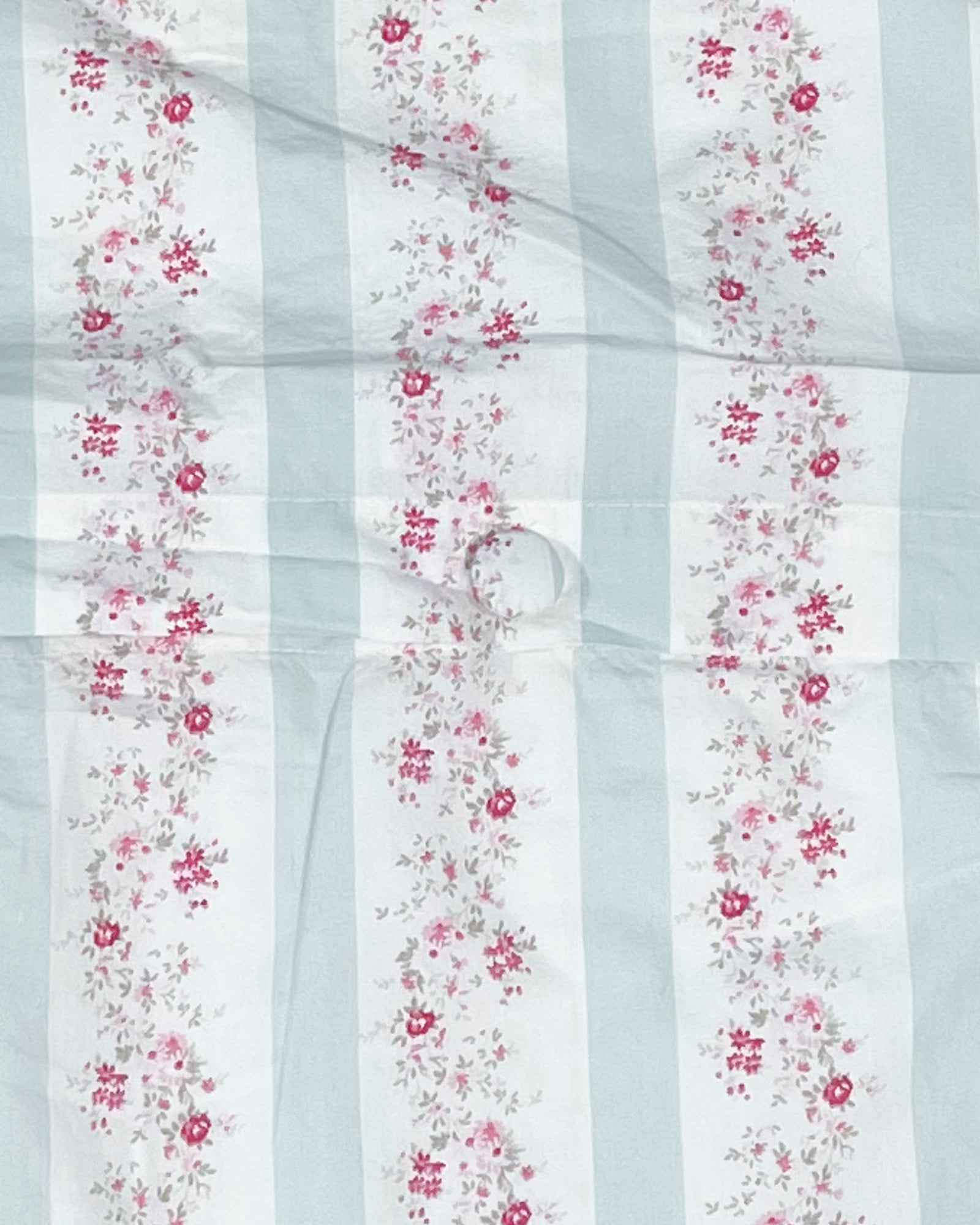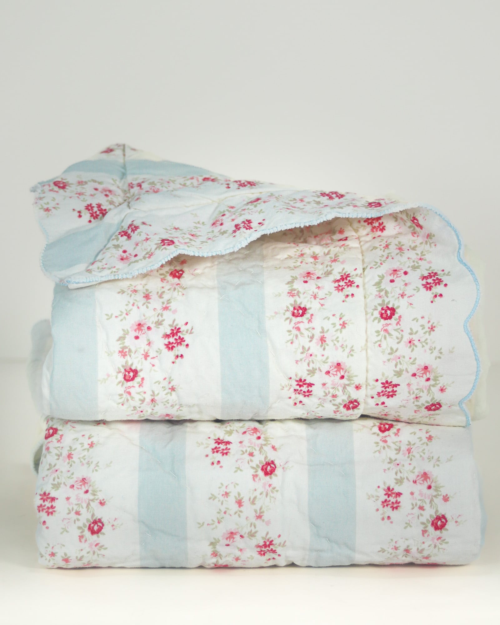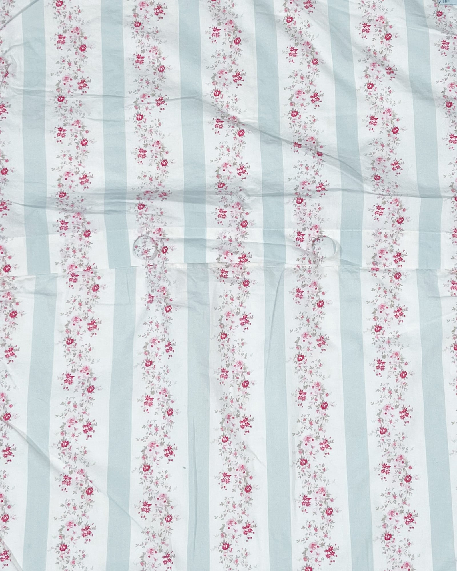 Soft and romantic, this Simply Shabby Chic quilted sham features delicate blush florals paired with classic blue ticking stripes. Designed with a scalloped edge and fabric-covered button closure, the generously sized envelope style creates a relaxed, full look perfect for layered cottage-inspired bedding.