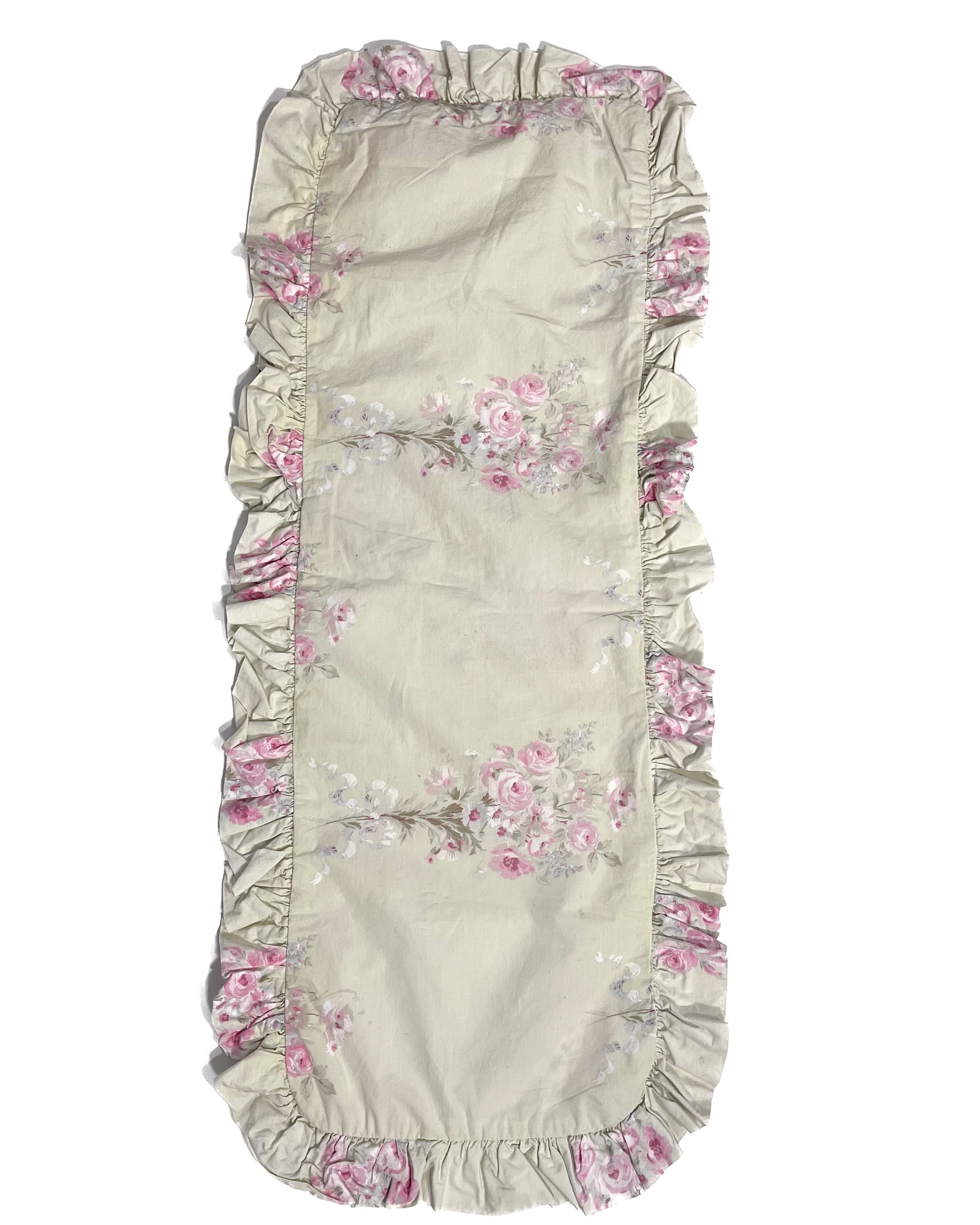 This Simply Shabby Chic bolster pillow features soft pink rose clusters on a muted sage background, finished with a romantic ruffled edge. The delicate ditsy floral pattern and relaxed cotton fabric reflect Rachel Ashwell’s signature blend of English garden charm and effortless California style.