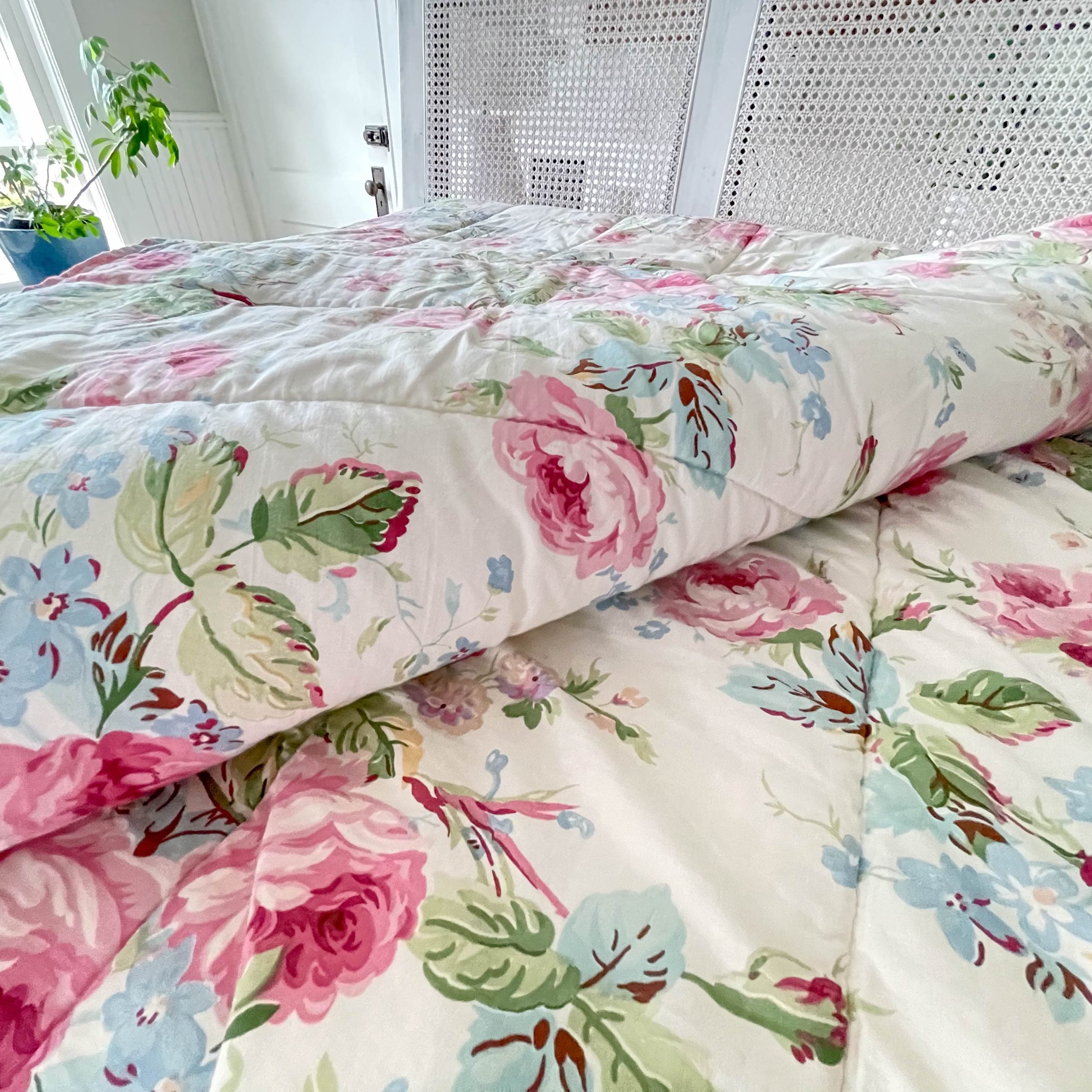 This vintage Ralph Lauren Water Floral Pink queen comforter is a wonderful find for collectors of discontinued Ralph Lauren bedding and for anyone looking to bring a touch of nature-inspired floral elegance and cottage charm into their home.