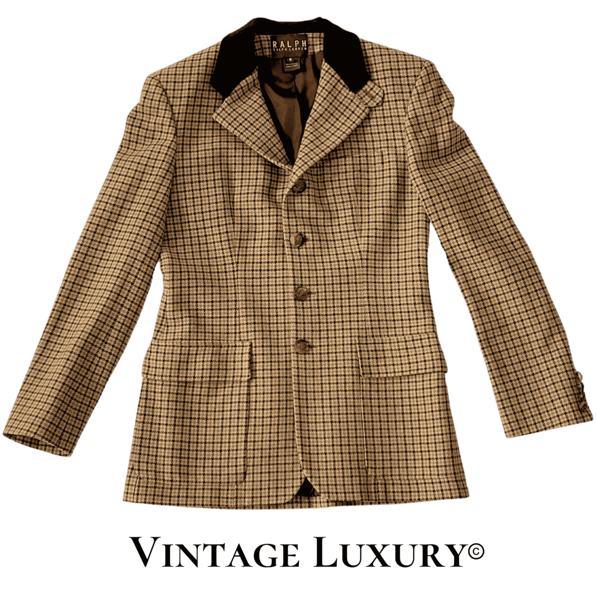 Vintage Ralph Lauren women’s tweed blazer in excellent condition, featuring a velvet collar and structured silhouette. Size 8. A standout piece of vintage apparel, this English country–style blazer adds timeless charm to any wardrobe and is ideal for fans of vintage blazers and classic tailoring.
