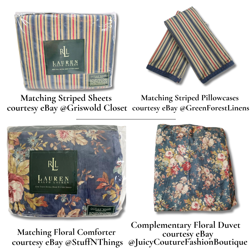 The original packaging placard (see above) for the Ralph Lauren Chadwick Collection beautifully stages each element on a perfectly styled bed, showcasing the art of layering in exquisite detail. The florals, stripes, and patchwork designs are arranged to highlight their harmony, with pillows and shams galore adding depth and dimension. Every piece is thoughtfully placed, from the cozy quilt draped at the foot of the bed to the neatly tucked striped sheets, capturing the timeless sophistication and inviting charm that define the collection.